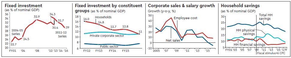 The proximate cause for this slowdown might—in fact, a bit paradoxically—be ascribed to the corporate sector. From a peak share of 41% in total fixed investment in FY08, corporate capex fell to 28% by FY13, and this is mirrored by a rise in the share of the household sector (the share of the public sector has remained more or less stable). This trend then reversed (in the new GDP series) from FY12 to FY16, with the share of the private corporate sector rising—the difference being the rising share of the public sector. Both segments had eaten into the share of households. This causation channel of the transfer might be explained heuristically as follows. The accompanying graphic also shows the worsening financial condition of India’s corporates (based on a sample of 2,400 companies), with a sharp drop in sales. This had a consequent adverse effect on employee salaries and wages, whose growth slowed from a high of 45% y-o-y in 2008, down to an average of 12-13% over the next few years, before dropping even further to sub-10% in FY16. The presumption is that this led to a drop in HH disposable and discretionary incomes, whose distribution between consumption and savings points to the cause of the investment slowdown. Private consumption expenditure had crept up over FY12-17, from 56% to 59% of GDP. Given shrinking incomes, this unfortunately seems to have depleted HH savings that fell from 25.2% of GDP in FY10 to 17.8% in FY16.