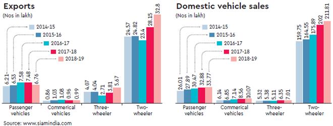 Exports of passenger vehicles (PVs) peaked in 2016-17 (see table), growing by only 9% over a five-year period. India has a long tradition of making commercial vehicles (CVs), yet export numbers are an embarrassment. Three-wheeler exports grew by 39% and those of two-wheelers by 33% over a five-year period. Two-wheeler exports grew at a good 20.3% and 16.5% in 2017-18 and 2018-19, respectively. One does not need to be an IIM graduate to know that exports compel manufacturers to improve quality, technology and reduce per unit indirect cost, amongst others.