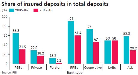 The corresponding table is interesting as it gives a clear picture of the quantum of deposits of banks that are insured in the true sense. The premium for insurance is paid by the bank, and, hence, the cost is not directly borne by the deposit holder even though it could be adjusted for in the deposit interest rate. The table shows that the PSBs, RRBs and cooperative banks have the highest coverage ratio in both the years. The private banks and foreign banks have lower cover, and in case of the latter it is really very low. This means that if deposits went bad for a foreign bank, the recovery through insurance would be miniscule.