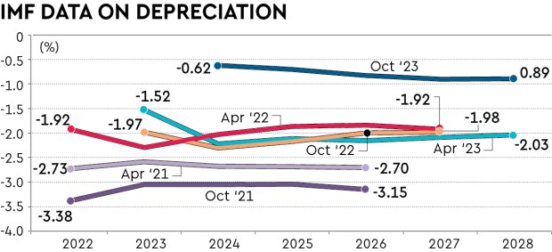 As noted in the graphic, the WEO in October 2023 made a remarkable change in the forecasts of INR vis-à-vis the dollar. Over the last three years, their forecasts for the depreciation of the rupee have been consistently narrowing: from around ~3%-3.5% pa in 2021 to a less than 1% pa depreciation forecast in Oct 2023. In absolute terms, this means that the forecast of the IMF for the USD-INR pair in 2028 is `83.90.