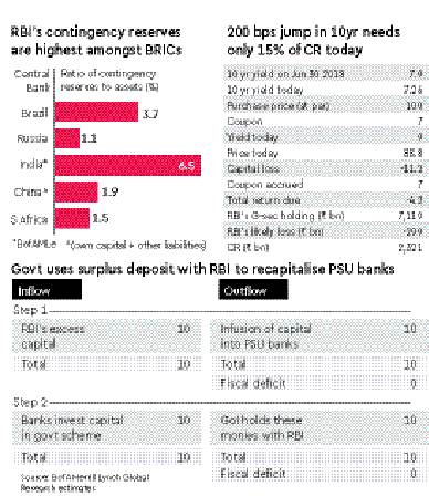 Media reports suggest that the expert committee, chaired by ex-RBI governor Bimal Jalan, to examine the RBI’s economic capital framework, will submit its report soon. How much will the Jalan committee identify as excess RBI capital? Contingency reserves would release Rs 1,282 bn if halved to 3.25% of RBI book from 6.5% now. This is still 50+% higher than BRICs’ (ex India) average. A 4.5% yield hike cover releases Rs 1,160 bn. It is estimated that the reserves would also release Rs 1,170 bn if restricted to cover a yield rise of, say, 4.5%, from about 9% now.