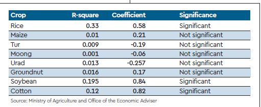 Third, in case of soybean, the coefficient of MSP is significant, which means that the price policy tends to be effective and the relation is good at close to 1. The explanation here is that since the procurement is by oil mills there would be a tendency for MSP to become a benchmark unlike other products where buyers are well-dispersed wholesalers.