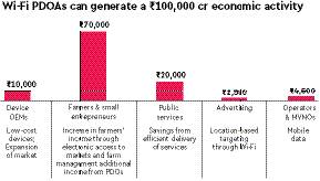-Democratising Wi-Fi access provisioning would lead to additional income for millions of small entrepreneurs. In fact, 10 million hotspots at a conservative Rs 1,000 monthly income translates to Rs 10,000 crore per year.