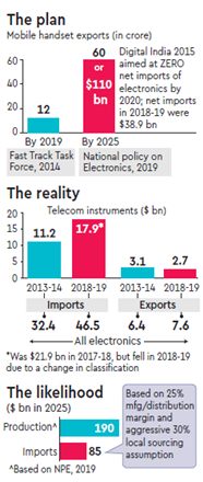 While on data, interestingly, the National Policy on Electronics (NPE) in 2012 hoped to create an overall demand for electronics—including mobile phones—of $400bn by 2020, the Digital India policy gave the same projection in 2015 and, more recently, NPE 2019 is also aiming for $400bn, though by 2025! Not surprisingly, given PMP’s inherent flaws, India has been way behind the targets. IAMAI reports that India exported just 18mn handsets in FY19 for $1.4bn or around a seventh of the target; for some reason, India’s export data shows a number of $2.7bn but that could include some components as well.