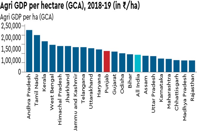 But, if one is to assess the real contribution of farmers/states to agriculture and incomes, the best way is to see what is the agri-GDP per ha of gross copped area in that state. This is an important catch-all indicator, as it captures the impact of productivity, diversification, prices of outputs and inputs, subsidies, etc, in just one indicator. On that indicator, unfortunately, Punjab is placed 11th amongst major agri-states (see graphic).
