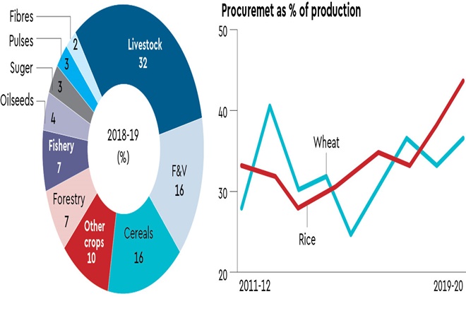 Over time, however, demand has changed; the climate has become variable, and the aspirations of farmers have risen. It is time to focus on farmers’ incomes, sustainability and nutrition. Some of this has happened already. Changes in markets and production are reflected in the composition of the gross value of output in agriculture and allied sectors. The ‘MSP crops’ (mainly, cereals, oilseeds, pulses and fibres) add up to only 25% of the value (2018-19). Farmers who produce the other 75% (mostly perishables) are dependent on the market and its price fluctuations.
