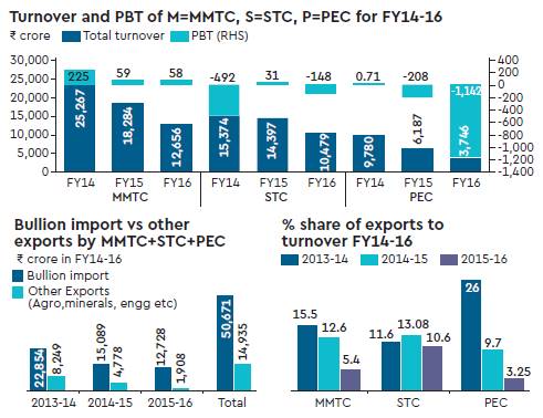 Trading involves cultivating buyers or sellers in India or abroad, taking logical market risk, hedging in future markets to mitigate risk, positioning for purchase or sale by going long or short. In the absence of these activities, it will be erroneous to call them “trading” enterprises. All businesses entail profit and loss. But in a governmental set-up, loss is an unpardonable sin. Profit is shared by all; loss is meant to punish a few who handled the deal. Officials saddled with such a rulebook of fear cannot do trading. If ethos of business is not geared for trading, then merging or any other permutation may not improve the performance of any newer entity. The ratio of export to turnover is dismal currently (see chart). Imports, especially of gold and silver, have a much higher percentage in turnover—the upside being 76% in STC in 2013-14. Bullion is sold at a nominal margin but has a very high risk probability. The continuation of bullion imports through PSUs can be reviewed, though MMTC is a dominant national player. The issue being whether bullion imports can be privatised to curtail it? The speed of communication has jumped in the last decade, where real-time information is available to all and sundry on various commodity exchanges and on Google. What is the “extra input” that PSUs can provide these days. With financial muscle dwindling, why would a private party engage with a PSU? The resurrection of these PSUs will be rewarding if they are empowered to “trade” in the real sense, allowed to take reasoned risk, develop competence in select commodities, demonstrate significant export performance, reduce dependency on associates/private parties and government-gifted business, given freedom to trade with or without tender depending upon circumstances and offer something “extra” to counter parties. Restructuring, though a laudable idea, but devoid of the above element, may not be meaningful.