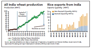 Where does India stand today in terms of wheat and rice? While India’s population has grown by more than four times, from 330 million in 1947 to 1.35 billion in 2018, our wheat production increased by over 15 times (from about 6.5 MMT in 1950-51 to 99.7 MMT in 2017-18). India contributes about 13% to the world wheat production, next only to China with about 17% share. Rice production shot up by about 5.5 times (from 20.6 MMT in 1950-51 to 112.9 MMT in 2017-18), accounting for about 23% share in world rice production, next only to China with about 29% share. India is also the largest exporter of rice in the world with about 12.7 MMT (where Basmati is 4.06 MMT and Non-Basmati is 8.65 MMT), valued at $7.7 billion.