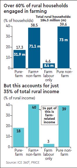 Price’s ICE 3600 survey defines this more sharply, and this shows (see graphic) that over 60% of all rural households in 2016 (its survey puts the total at 184.3 million households) have some connection to agriculture. Around a fifth (21.9%) of households get all their income from the farm sector, and around 40% get no money from farming; the rest earn their living from the farm sector but supplement this by working in industry and services as well.
