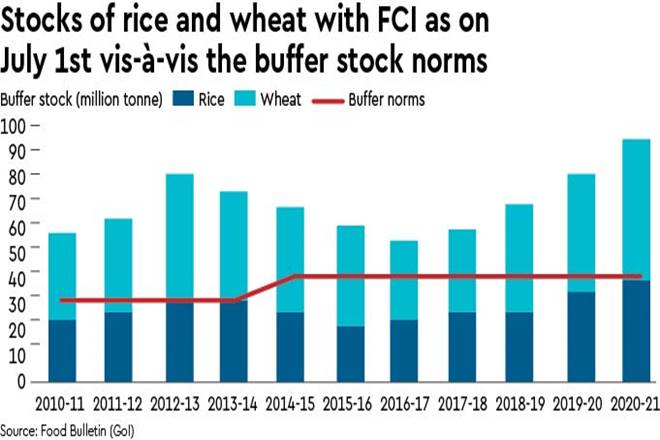 MSP is implemented primarily in paddy and wheat in selected states, and in recent years, some amounts of pulses, oilseeds, and cotton are also bought by the government occasionally. Look at the results of MSP-dominated system of rice and wheat. The stocks with the government are bulging way above the buffer stock norms (see graphic). The economic cost of procured rice comes to about Rs 37/kg and wheat at around Rs 27/kg. The CTC (cost to company) of departmental labour of the Food Corporation of India (FCI) is 6-8 times higher than contract labour in the market. No wonder, market prices of rice and wheat are much lower than the economic cost of FCI. In Bihar’s rural areas, for instance, you can easily get rice in retail market at Rs 23-25/kg. The bottomline is that grain stocks with the FCI can’t be exported without a subsidy, which invites WTO objections.