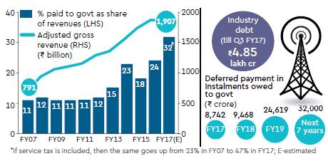 While an inter-ministerial group of bureaucrats was set up to come up with a solution, reports suggest it is going to offer only minor relief—while telcos have 10 years over which to make payments for the spectrum they had bid for in the past, this is to be extended to 16 years. Apart from the fact that this doesn’t address the core issue of negative profitability, this means the banks that have lent telcos the money are likely to suffer big capital losses and the government also stands to lose if telco revenues suffer—with inflows from telcos to the central government projected to fall from Rs 78,715 crore in FY17 to Rs 44,342 crore in FY18, the share of non-tax revenue coming from telecom is down from 23.5% to 15.4%; it could fall even more if, like this year, telcos are too cash-strapped to participate in fresh auctions.