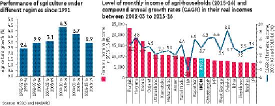 The attached graphic also presents the monthly incomes of agri-HHs in major states of India and for all India, as estimated in the NABARD’s latest survey on financial inclusion, often called the NAFIS for 2015-16 agricultural year. Punjab agri-HHs had the highest monthly income of `23,133 while Uttar Pradesh, with `6,668 is at the lowest rung. Overall, at an all-India level, the average income of an agri-HH in 2015-16 turned out to be just `8,931 per month. The compound annual growth rates (CAGR) of real incomes between 2002-03 (NSSO survey) and 2015-16 (NABARD survey) comes to 3.7% at the all-India level, with a high of 8.4% for Odisha (though with a low base) and minus (-) 2.3% for J&K agri-HHs. It may be noted that the CAGR is very much impacted by the base or terminal year’s performance of agriculture. It is interesting to see that the CAGR of agri-GDP for the period 2002-03 to 2015-16 is 3.8% while CAGR of agri-HHs incomes is 3.7%.
