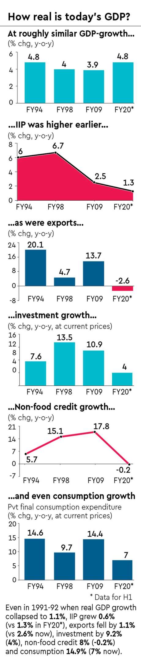 Even when many in the government criticised ex-chief economic advisor Arvind Subramanian for saying India’s GDP was overstated by 2.5 ppt, few could explain why, if GDP was growing so fast, other indices were growing so slowly. As India’s GDP has collapsed to 4.5% in Q2FY20, other indicators (see graphic) suggest that even this may be an overestimate. Even in FY94, when GDP grew at roughly the same rate as today, IIP grew at 6% vs 1.3% now, exports at 20.1% (-2.6% now), private consumption at 14.6% (7% now), and, the biggest surprise, while non-food credit was 5.7% then, it is -0.2% now; if everything is collapsing, how is GDP growing?