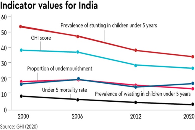 Nevertheless, there are a few green shoots in terms of India’s trajectory in the GHI. Over a span of 20 years, India has made progress in its GHI values and stunting rates amongst children. There has been a notable reduction in the under-five mortality rate—down to 3.7% in 2020 from 9.2% in 2000. However, we are getting worse in terms of wasting amongst young children—it implies that Indian kids are too thin for their height. There is a need to understand and investigate the reasons behind this situation. These statistics are projected to get worse in the near future in the wake of the pandemic as it is mainly the poor and hungry that are severely impacted. In India, the problem is not with respect to food availability, but inequitable distribution and massive food wastage.