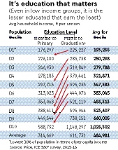 In the second decile, households headed by illiterate people earn `125,594 as compared to nearly double that—`243,848—if the level of education is even primary school and to `315,303 in case a graduate-level education is completed. For illiterate-to-primary households, as a group, the income was `226,100 as compared to `285,738 when the education levels are from matriculation to graduation.