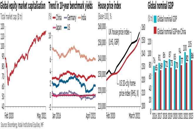The growing divide between ‘income’ and ‘wealth’ raises a controversial point about the role of central banks in exacerbating the ‘divide’. Global market capitalisation has increased around 30% since the start of the pandemic while global GDP (and hence household income) is down. Central banks seem hesitant to ‘exit’ from their ultra-loose monetary policies perhaps fearing ‘taper tantrum’ and bond markets have been beaten into submission—an unhealthy combination.