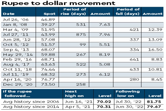 Currently, the rupee has strengthened by a little over 3 rupees since its last low in April 2020. Eschewing any fundamental thinking in favour of the belief (?) that history can provide some pointers to the future, the next cycle for the rupee would play out thus (see graphics).