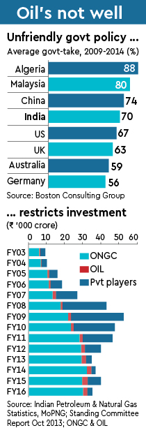 It gets worse in the case of crude oil where private producers do actually get market-determined prices. But in the case of Cairn which produces a superior quality crude and wanted to be able to export it to get a better price, the government has not allowed this and forces it to sell to PSUs and private refiners like Reliance and Essar at the price of inferior crude produced by ONGC and others. And when Cairn found more oil reserves and wanted to extend its mining lease, the government took years to okay this, and when it did, instead of being grateful for the extra production, it asked Cairn to pay a revenue share of 10 percentage points more than it did earlier! And that is when the share the government takes is, in any case, on the high side (see graphic). Indeed, while the government kept hiking the fixed cess it charged on oil output—it rose to $9 per barrel when oil was at $100 and remained at that even when oil fell to $28—when it moved to ad valorem rates in the last budget, the rate was fixed at 20% to ensure the industry still paid $9 per barrel!