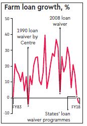 It gets worse. While agriculture credit continues to grow, as it should, given the law mandates 18% of bank lending be directed to this sector, there has been a dramatic contraction in loans in certain states. In the case of Uttar Pradesh, an RTI inquiry by The Indian Express showed, agriculture credit fell to Rs 91,628 crore in FY19, from Rs 97,707 crore in the previous year. For Karnataka, the numbers contracted to Rs 78,517 crore from Rs 90,195 crore, and for Punjab, to Rs 66,766 crore from Rs 72,020 crore. All states, the Express posits, were those that had loan waivers in the past, and this made bankers reduce credit levels.