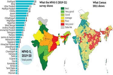a) The total fertility rate (children per woman): The all-India average has reduced to 2 in 2019-21, versus 2.2 in 2014-15. However, Uttar Pradesh, Bihar, Jharkhand, Manipur and Meghalaya are higher.