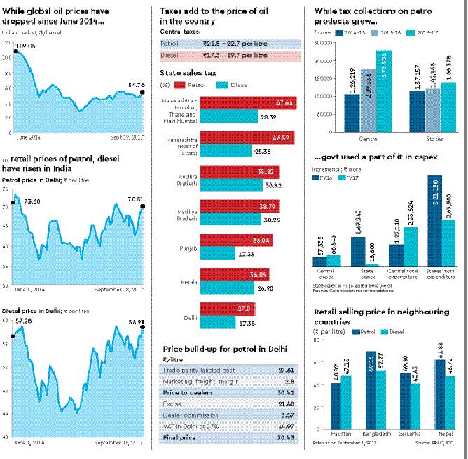 Even though global oil prices have halved since June 2014, retail prices of petrol and diesel in India have remained more or less unchanged since then. High central and state taxes have offset any easing of prices that could have been possible because of the reduction in crude prices. For instance, in Delhi, the central excise duties and state VATs comprise around 52% of the retail price of petrol and around 44% of diesel’s. VAT rates vary across states, from 20% in Mizoram to as much as 48% in Maharashtra on petrol. In case of diesel, it varies between 12% in Mizoram and 38% in Madhya Pradesh.