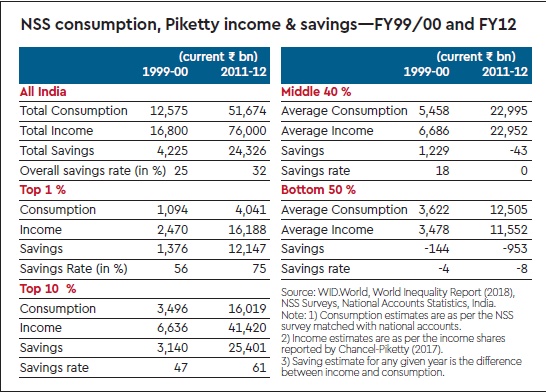 The method of computation is straightforward—consumption shares are taken from NSS consumption survey for FY12, the income shares from Chancel-Piketty. Given national income accruing to households (obtained from Piketty World Income Distribution database, WID), and the shares of each group in national household income (again, obtained from WID), one can obtain the absolute value of nominal income in command of each group. Consumption of each group (top 1%, top 10%,etc) is obtained from the NSS consumption survey for FY12. The difference between income and consumption is the savings of each group.