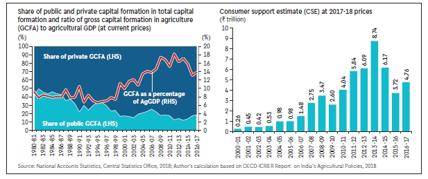 The first step in that direction will be to change the policy mindset, and eliminate the in-built consumer bias in our food and agri-policies. This requires stopping subsidising consumers by suppressing food prices through archaic laws of the 1950s (such as the Essential Commodities Act, 1955). As per OECD, the Consumer Support Estimate (CSE) for India for the period 2000-01 to 2016-17 is about `3.13 trillion lakh crore per annum at 2017-18 prices, and about 81% of this comes from farmers who cannot realise best prices for their produce due to restrictive trade and marketing policies.