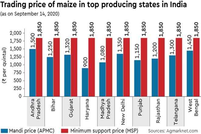 Although the government of Haryana promised purchases at MSP for maize, set at Rs 1,850 per quintal, the procurement has been at Rs 800-Rs 1,000 per quintal below the MSP. The Punjab government was no better, as it procured maize at Rs 500 below the MSP. In Rajasthan, the mandi price for maize is Rs 1,200 per quintal, which is Rs 600 lower than the existing MSP.