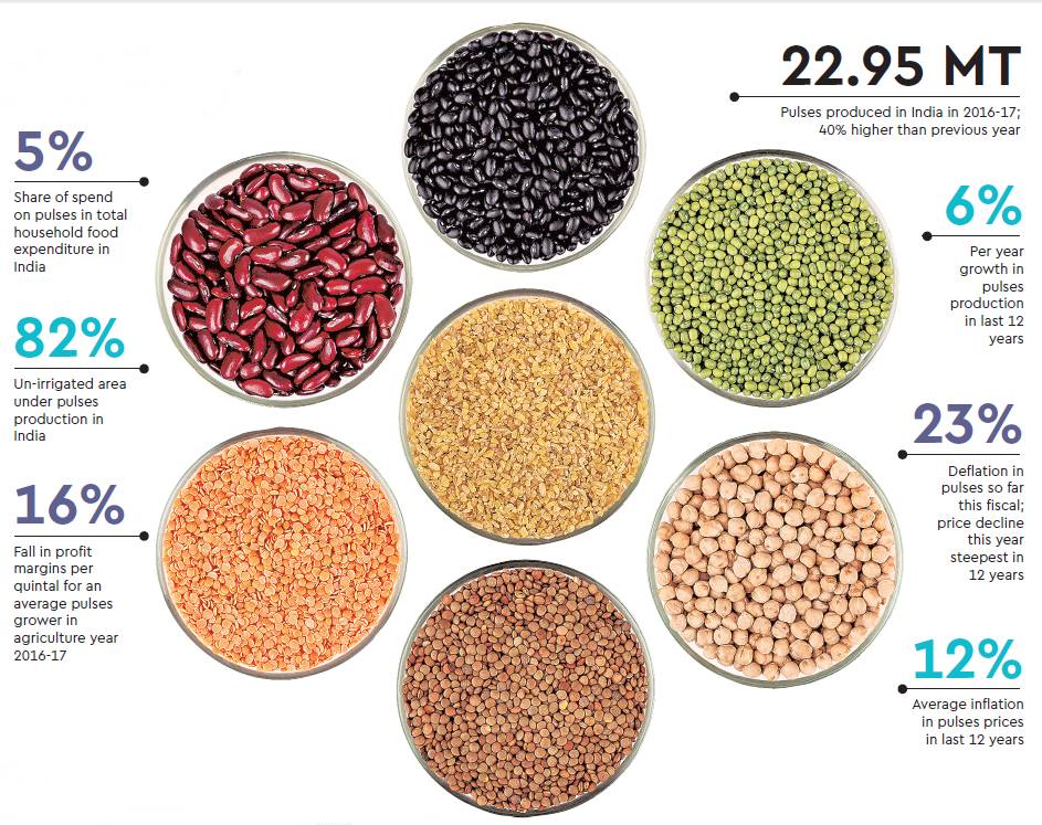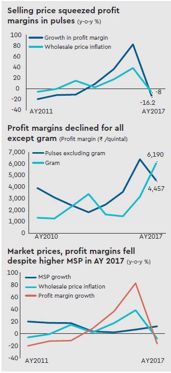 While agriculture year (July-June) 2016-17 saw record-high pulses production, profit margins for all pulses except gram (chick peas) declined by an average of 30%. This was despite the fact that there was a 12% increase in minimum support price of pulses.