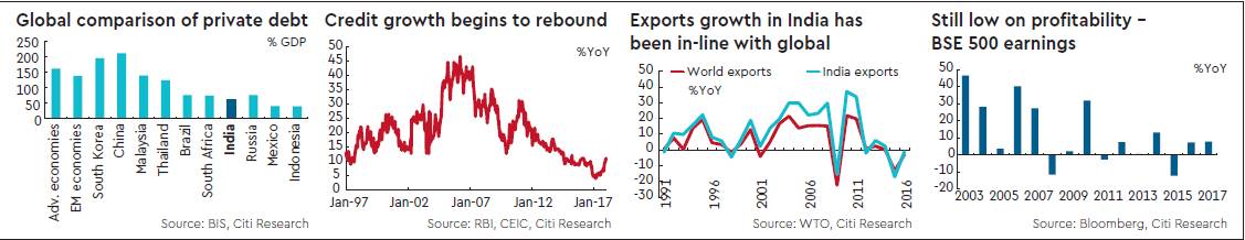 The Economic Survey for 2016-17 noted that around 40% of India’s corporate debt was held by corporates with an interest coverage ratio of less than one which suggests an acute stress in the corporate sector. As discussed in the survey, some of this can be attributed to an over-leveraging in the past boom cycle especially in the infrastructure sector (power, steel, telecom), and a course correction may be warranted (aided by regulatory and legislative measures). Furthermore, with asset sales by leveraged firms and fresh capital raising the corporate leverage could ease up. However, with India’s private sector debt-to-GDP at less than 60% of GDP, considerably below the emerging market (EM) average of 137% of GDP and advanced economy (AE) average of 160% of GDP, we believe there is large scope for India Inc to take up good debt even while the bad debt problem clears up. Roughly, even a 16% annual rise in private debt would lever up private debt to close to 80% of GDP, still a favourable condition among the rest of the EM pack.