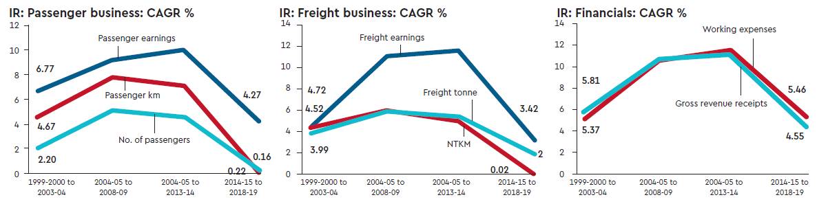 Whereas IR’s gross revenue receipts show a CAGR of 4.55%, its working expenses a CAGR of 5.46%—a 20% higher CAGR of expenses than revenues over the five-year period. Its management needs to heed to Charles Dickens’s fictional character Wilkins Micawber’s sage advice: “Annual income twenty pounds, and expenditure nineteen and six, result happiness. Annual income twenty pounds, and expenditure twenty pounds ought and six, result misery.”