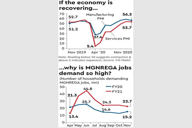 So, while auto sales or other such indicators show the economy is in ‘recovery’ mode—PMI is pretty much at pre-Covid levels—it is equally true that there has been a 50% jump in the number of rural households looking for low-paying MGNREGA jobs; from an average of 18-mn households per month in Apr-Nov 2019 to 28-mn in Apr-Nov 2020. Why would so many be looking for such poor-quality jobs if the economy was recovering so well? Almost all the data we are seeing right now pertains to the organised sector. Indeed, to the extent the organised sector’s share is rising—due to people buying more online—this hides the collapse of the unorganised sector.