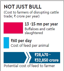 If the cost of feed is assumed at Rs 60 per day for each animal, being forced to look after 15 million animals each year means that is an additional cost of `32,850 crore that hapless farmers will have to bear if the rules choke off livestock slaughter; this does not include the Rs 4,000-5,000 per animal that farmers no longer get for old cattle. The actual costs for the farmers will be higher as time goes by, since 14-15 million is the annual addition to the number of animals that farmers will not be able to sell and will need to look after.