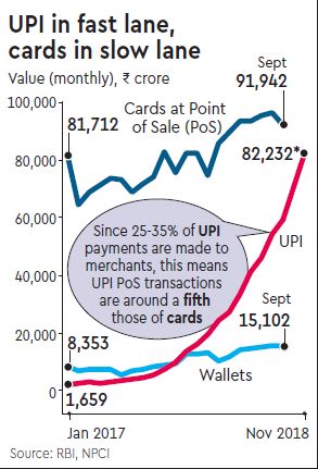 In November 2016, when demonetisation took place, UPI-based payments were just 1.7% of the payments made to merchants (Point of Sale, in jargon) using debit/credit cards—Rs 1,000 crore versus Rs 58,734 crore. Even this, though, wasn’t strictly comparable as a negligible proportion of UPI payments was made to merchants—this is around 25-35% today—and most were just person-to-person transfers. So when, in September 2018, UPI rose to Rs 59,835 crore (a jump of 60 times) compared to Rs 91,942 crore for cards at PoS (a jump of 1.6 times), the most obvious conclusion is that, within a few years, UPI will finish off cards (see graphic).