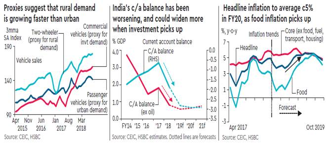 In addition, the ongoing depreciation of the rupee is likely to make services exports more competitive over time. However, the rapid rise in imports is likely to offset all of these gains in exports (even if the rate of deterioration is lower than last year). Any meaningful improvement, in HSBC’s view, can only come from structural reforms, particularly in exports. In some sense, all of this is the story of yesterday. The next few quarters are likely to be marked by some moderation in activity (from 8.2% y-o-y GDP growth in Q1FY19 to sub-7% by Q4FY19).