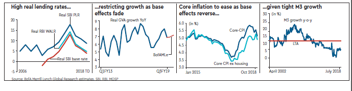 High real rates are hurting growth. With H2FY19 inflation set to average 3%, the ex-post real policy rate/1-year T-Bill rate would rise to 3.5/4%, well above RBI’s 1.25-1.75% band (it is preferable to see real rates ex-ante though). Not surprisingly, GVA growth is slipping to 7% levels from 8% in June with a liquidity crunch aggravating base effects. By adjusting for base effects and by taking averages of the September 2017-18 quarters, growth works out to a 6.5%, well below the 6.9% average of even the new GDP back cast series.