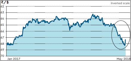 The wheel turned in February when oil and the dollar started to climb. The DXY rose steadily reaching 94 by May. Perhaps, finally acknowledging the need for a weaker rupee, RBI allowed virtually all of the dollar’s strength into the domestic market. The DXY appreciated by 5.8% and the rupee fell by an almost identical amount to 67.80. The move was very sharp and RBI had to intervene every day to prevent the decline from turning into a rout. Indeed, the rupee had crossed 68 and was threatening further weakness, till news that Saudi Arabia and Russia had agreed to increase production hit the market late last week, which pulled the rupee back above 68.