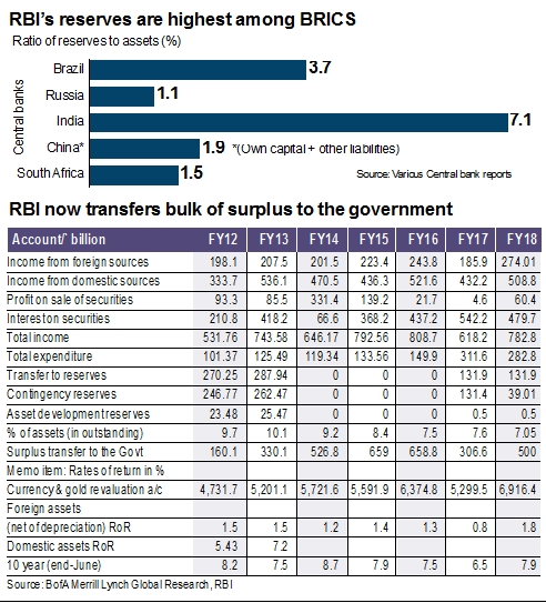 Government surplus with RBI is at Rs 1675 billion/$23 billion/0.9% of GDP as of March 2018. This emanates from state government surpluses (parked in intermediate T-Bills), higher than expected small savings as well as deferred expenditures. Contingency reserves are at Rs 2321 billion/$32 billion/1.3% of GDP as of June 2018. This is essentially built out of interest income from RBI’s G-sec and FX portfolios. If RBI earns Rs 10 from its existing FX portfolio, it invests the same in an additional FX asset with a mirror entry in the Contingency Reserve in its net non-monetary liabilities (NNML) account. Hence, the transaction set is liquidity neutral.