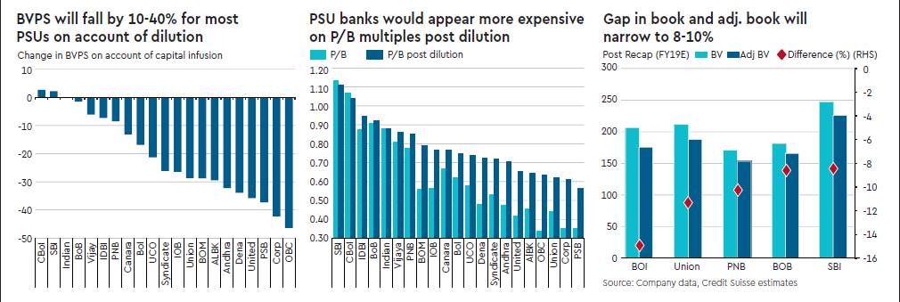 While this move could lead to dilution of book-value given current market prices, it could also lead to a shift in valuation from multiples based on adjusted book to actual book. We estimate that there will be a 20-200% dilution from the recap (assuming dilution at 20% premium to current market price), which will push up the price-book ratio (P/B) of these banks to 0.6-1x, as dilution will be at a discount to book. The past few years, these banks have been valued on an adjusted book basis on account of the: (a) under-provisioning, and (b) under-capitalisation. We estimate the 20-200% dilution from the recap will push up the P/B of these banks to 0.6-1x (as dilution will be at a discount to book).