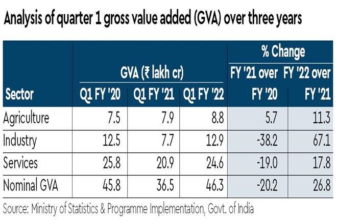 GVA estimates for FY22 show that nominal GVA was up 26.8% in Q1FY22 against -20.2% in Q1FY21. The latter, of course, was perpetuated by the effects of Covid-19 and subsequent national lockdowns. The country’s nominal GDP for Q1FY22, while growing a promising 31.7% over Q1FY21, has not recovered fully to be on par with economic trajectory pre-Covid-19. This is partly due to the lockdown impact of the second wave.