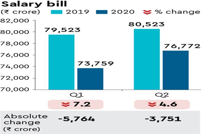 In the first quarter of FY20, the salary bill came down by 7.2%, which was followed by a 4.6% fall in the second quarter—a reduction of Rs 5,764 crore and Rs 3,751 crore, respectively. Thus, the cumulative fall was close to Rs 9,500 crore. This was mainly due to salary cuts and reduction in headcount by several companies; the services sector, which remained virtually closed during the first two quarters, was the worst-hit. It was only in October that things eased to an extent.