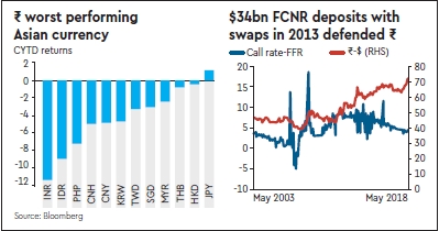 All three NRI bond issuances—1998, 2000, 2013—were able to fend off contagion. Experience shows that only one of the three monetary tightening actions—1998—had even partial success. Is a NRI deposit rate hike not good enough? This will surely be able to draw higher NRI savings. A NRI bond with an implicit RBI/sovereign guarantee typically enables the NRI to leverage global savings to augment the RBI’s FX coffers. The government could raise $5bn via a sovereign bond, but that would unduly expose domestic rates to global volatility. In any case, NRI bonds can raise 7x without MTM risks.