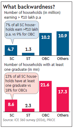 Apart from what this does to merit in a competitive world, ironically, all of this assumes that since all SC/ST have suffered centuries of discrimination and prejudice, they have real barriers of access to opportunity. Data from the Price’s all-India survey (see graphic) for 2016, however, show no such across-the-board backwardness. At a macro level, the 66 mn SC households in the country have an annual income of Rs 180,270 as compared to Rs 169,222 for 25 mn ST households, Rs 197,419 for 120 mn OBC and Rs 242,589 for 69 mn upper-caste (UC) households. This doesn’t suggest historical backwardness.