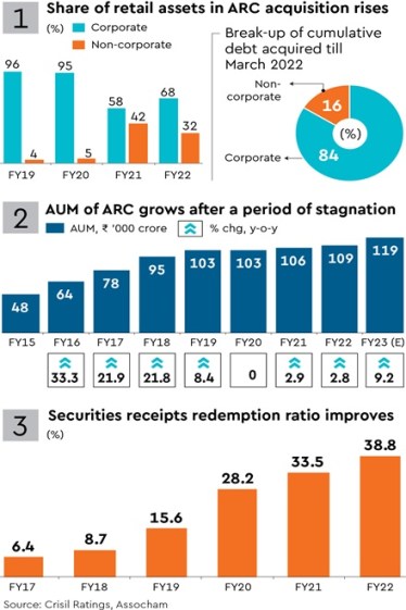 The share of retail in overall debt acquired by asset reconstruction companies (ARCs) has gone up significantly—from 4% in FY19 to 32% in FY22—because of the pandemic-hit MSME sector.