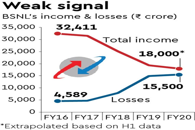 Given that the government cleared a Rs 70,000-crore rescue package for BSNL-MTNL—add another Rs 27,000 crore for the 900MHz spectrum renewal costs—just a year ago, it probably means it is serious about the two telecom PSUs surviving. Never mind that the bailout package is hopelessly ambitious (bit.ly/37RG394) as a result of which there will probably be another few bailout packages later. While BSNL’s revenues fell 45% in four years from FY16 to FY20 (see graphic), the revival packages assumes they will rise 90%, from Rs 18,000 crore in FY20 to Rs 34,270 crore in FY24; indeed, while the revival plan assumed an income of Rs 21,338 crore in FY20, the maximum revenue in that year is likely to be Rs 18,100 crore if you just double the first half’s reported revenue of Rs 9,034 crore. Even more worrying, however, is that even after coming out with such a generous bailout package—BSNL has 165,000 employees and MTNL 22,000—the government seems to be doing its best to ensure the PSUs don’t survive; indeed, no lessons seem to have been learned from the 2000s when BSNL’s lack of mobile phone capacity led to its steady downfall in even rural India.