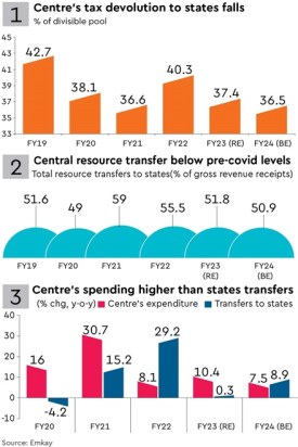 With the increasing imposition of cesses and surcharges by the Union government, the states’ share in the divisible tax pool has stayed below the 15th Finance Commission’s recommendation of 41%, and is expected to be around 36% in FY24 (BE).