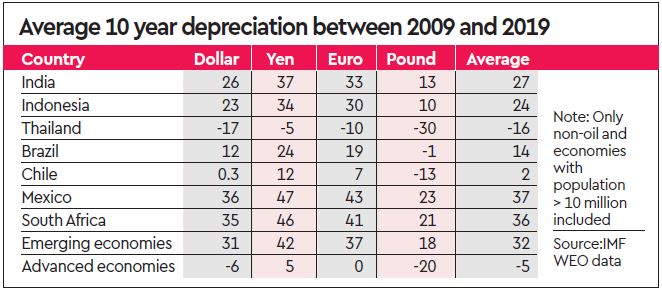 Data on 10 year currency depreciations are reported for several countries for the period 2009 to 2019. This assumes that each country started borrowing in 1999, one year after the East Asian crisis. Respected scholars (and respected policy makers) hark back to the Asian crisis for clues about what will happen to India’s exchange rates over the next decade. Do these esteemed scholars recognise (let alone appreciate) that the rupee/dollar exchange rate was Rs 42 in 1998 (Asian crisis) and Rs 40 ten years later in 2007? This, despite Indian inflation rates averaging 3% higher, per year, than the USA during this period.