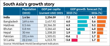 Currently, South Asia is not a big part of India’s trade story, even though some countries have economic potential. Its growth story so far can be divided into three parts. India and Bangladesh have better growth prospects; Nepal, Bhutan and Maldives are reasonable; and Pakistan and Sri Lanka have weaker prospects, as illustrated in the accompanying graphic.