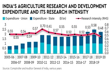 Scaling up such pilot experiments is critical for wider, more sustainable impact, and that is where one needs larger allocations of funds for agri-R&D. Our analysis of ARDE spends since 2005-06 reveals that although, in absolute terms, the total expenditure has increased from Rs 39.6 billion ($0.91 billion) in the triennium ending (TE) 2008 to Rs 163 billion ($2.2 billion) in TE 2020, but the research intensity (RI)—ARDE as a percent of agri-GDP—has experienced an upswing from 0.55% in 2005-06 to its peak of 0.70% in 2010-11, before declining to 0.48% in 2019-20 (see graphic).