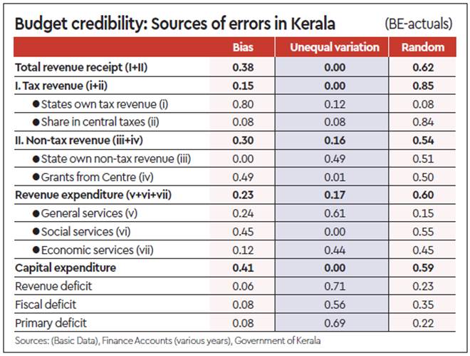 Kerala has fiscal deficit to GSDP ratio higher than the rule-based numerical threshold, which clearly shows the fiscal stress to achieve fiscal consolidation through revenue buoyancy and not through expenditure compression. Therefore, it is crucial to analyse the budget credibility of the State, disaggregating various macro-fiscal variables (see table).